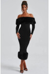 Zarafetin modern yorumu: Bu modal kumaş kürk detaylı maxi elbise, sade şıklığı ve sofistike detaylarıyla göz kamaştırıyor. Omuzdan açık tasarımı, kolları ve etek ucundaki yumuşak kürk detaylarıyla gece davetlerinde fark yaratmak isteyenler için mükemmel bir seçim.